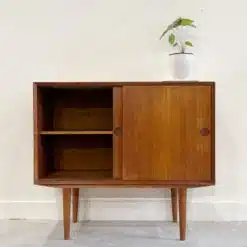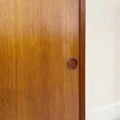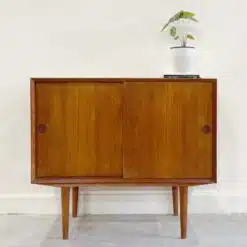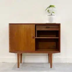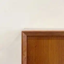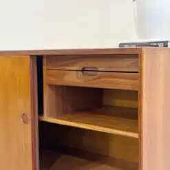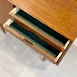 剛開箱的一只美櫃,簡潔與對稱的線條是入眼的第一印象,正面邊緣的細緻導角,搭配左右滑門的圓形把手,與兩層抽屜採用內凹槽把手,內斂的調性互相呼應,打開抽屜,內裡鋪著深綠色植絨布,靜靜展現想多看一眼的細節。