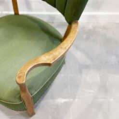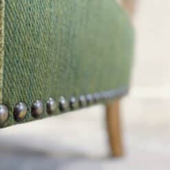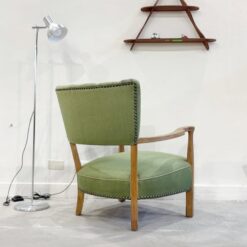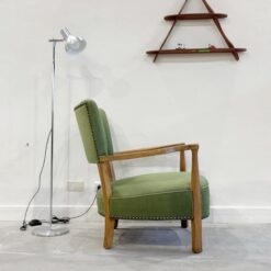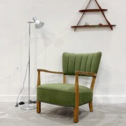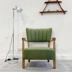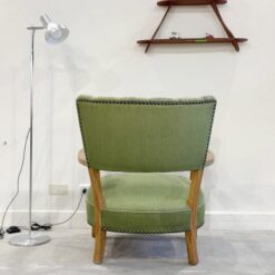 一張來自50年代散發著濃濃懷舊氣息的扶手椅,深綠色的直紋布料搭配木質調,線條樸實而溫潤。椅背以分段立體縫線勾勒出柔和的弧度,置於空間之中簡直來到50年代的場景。椅架選用自然中性色系的橡木,細節處如椅緣的鉚釘裝飾,為整體增添一抹復古韻味。它不是華麗取勝,而是低調地讓人一坐下就安心。