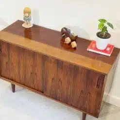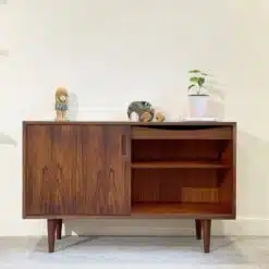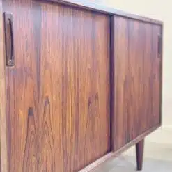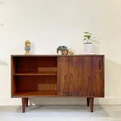 丹麥家具製造商Hundevad所生產的一款玫瑰木邊櫃,左右二片滑門設計保有走道空間的使用彈性,櫃內有高低可調整的層板及一個小抽屜,抽屜內舖有綠色植絨布,可收納不少物品,簡潔優雅的調性,大小適中的尺寸,居家或商空都合適。